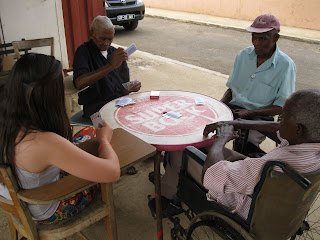 Após isto, juntamo-nos aos restantes idosos na "sala de convívio" a ouvir uma banda construída por eles e a dançar. Mesmo com esta idade eles cantam, tocam e dançam como gente nova. E ficaram mesmo felizes por nos ver dançar com eles. Após o almoço (peixe com batata doce), fomos chamá-los para irem para a sala de convívio. Contudo, como não queriam sair dos quartos, apenas tivemos a companhia do Sr. Luciano, do Sr. Francisco e do Sr. Severiano. Jogamos às cartas e eles ensinaram-nos a jogar ao 61 e à sieca cabo-verdiana. No 61 ganhei várias vezes mas, honestamente, não percebi nada das regras. Era como fosse melhor para eles, uma vez que o meu parceiro me virava o jogo e escolhia a carta para eu jogar. A única coisa que percebi do jogo é que o 5 vale o mesmo que o 7 em Portugal. Boa Joana, aprendeste uma regra! Quanto à sueca cabo-verdiana é parecida com a nossa mas com baralho e sem ser preciso assistir.